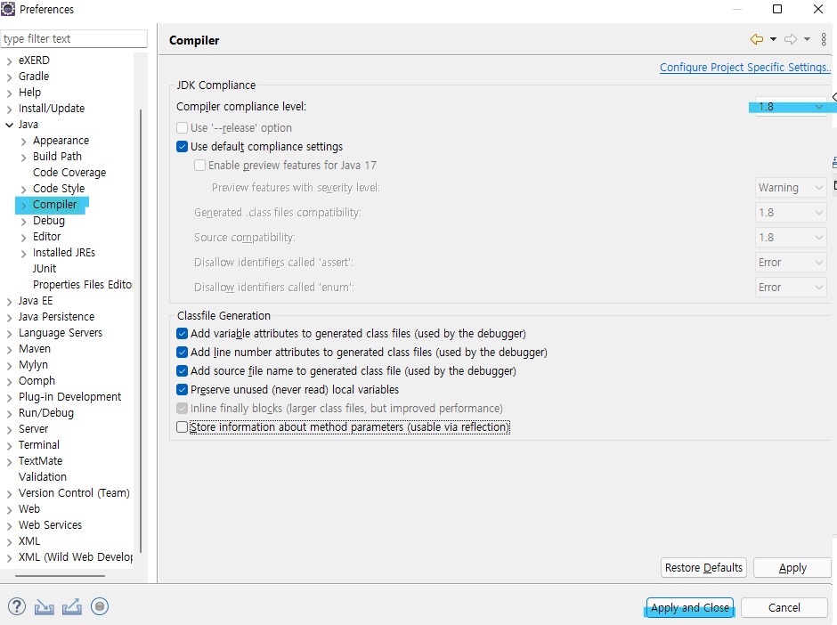 4. compiler > Compier complance level: 1.8로 설정 > Apply and Close 클릭